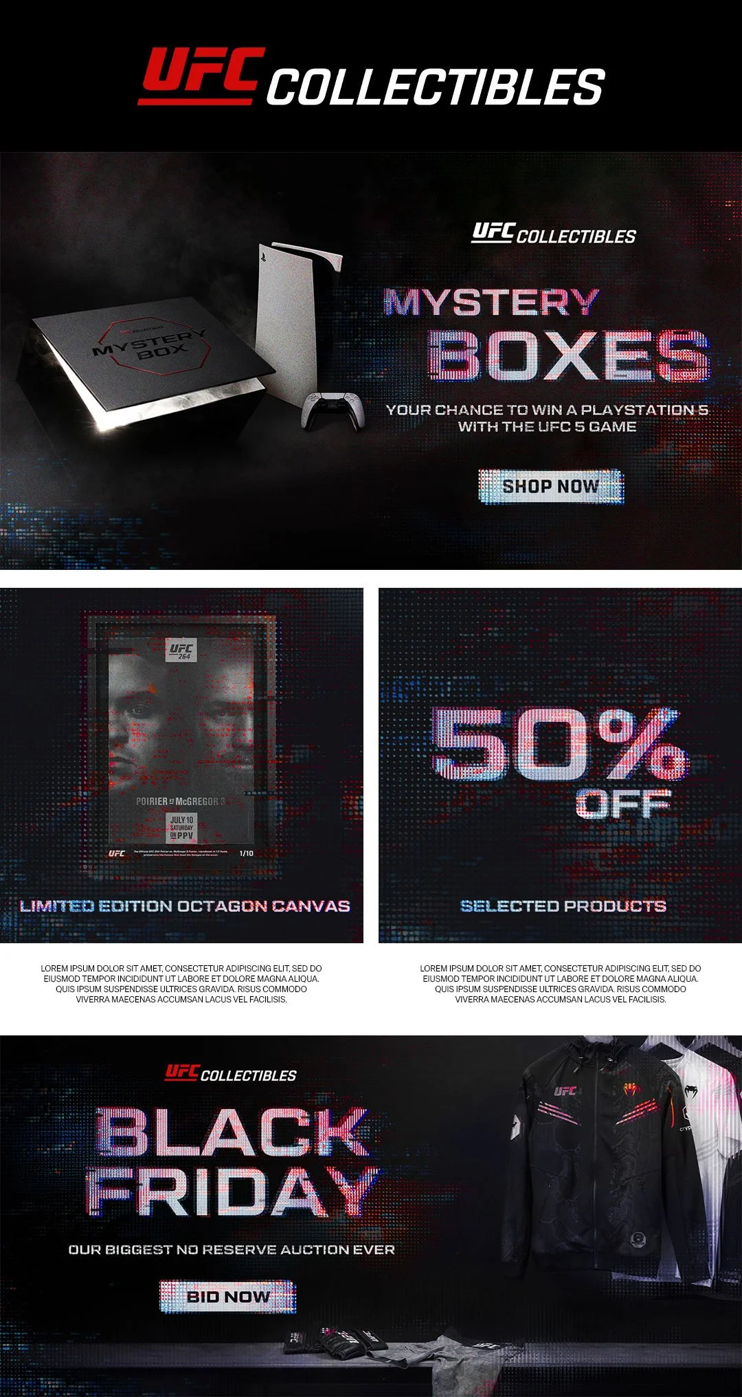 For the Black Friday email, I built a high-impact layout that turns a standard promo message into a branded moment. The design uses a tight typographic hierarchy, a bold contrast-driven colour palette, and layered graphic elements to create urgency without clutter. I worked with a flexible module-based system so the design can adapt to different offers while remaining visually consistent across the campaign.